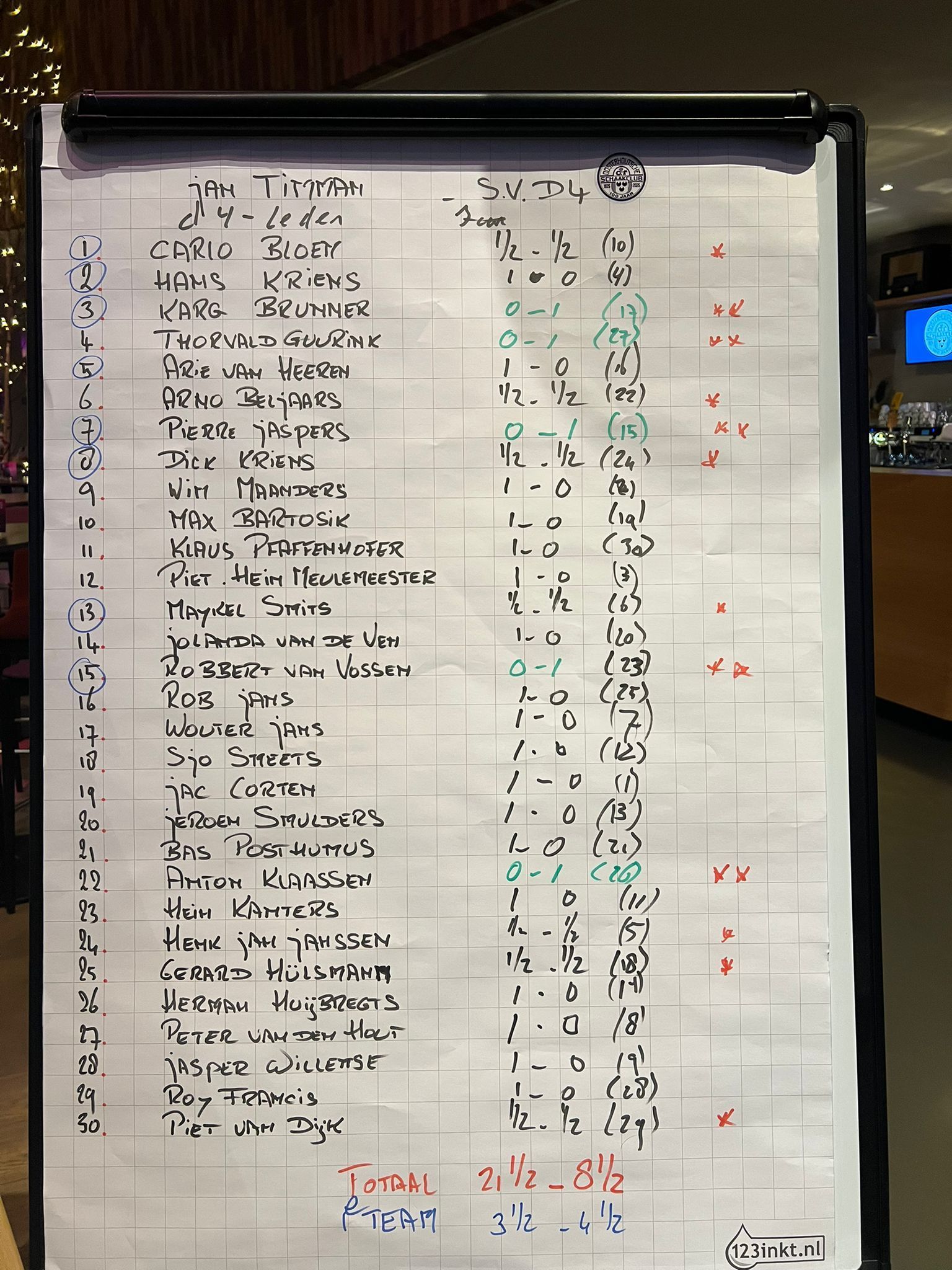 Vier Tienen en een aubergine(20), de Vliegende Paarden(19,5) en Met de vlag op vallen(19,5) volgden. Onderaan hadden de huisschakers moeite het geweld bovenin te volgen. De Schaakmatties gingen er uiteindelijk met de aanmoedigingsprijs vandoor!
